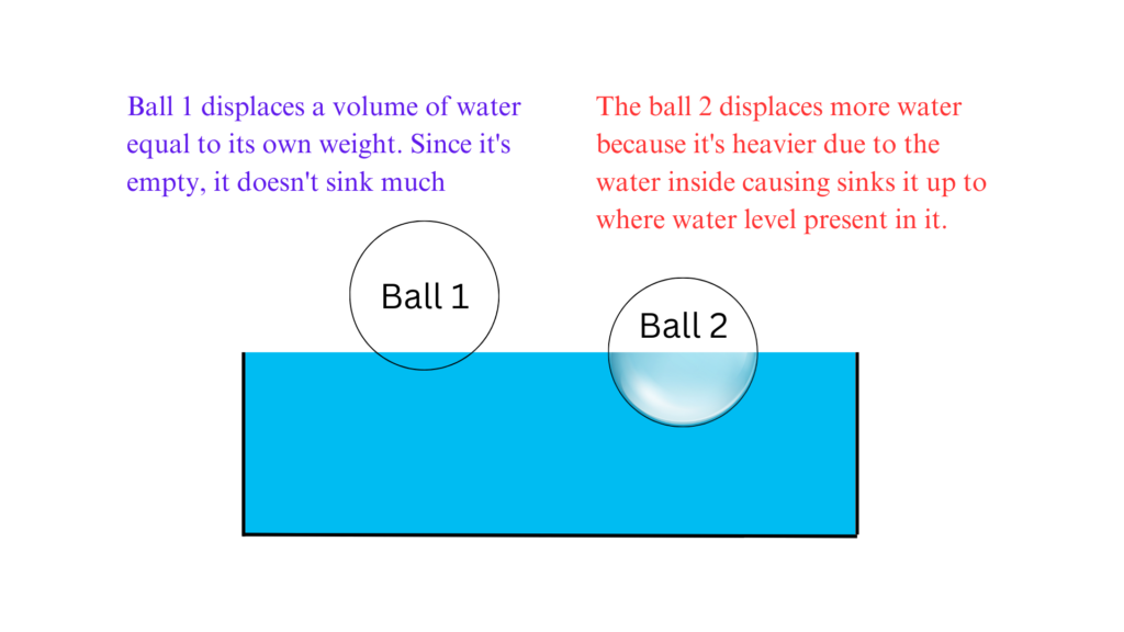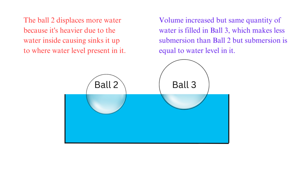 Looking at another aspect, consider the size or volume of the balls. If you take a larger ball and fill it with the same amount of water as the smaller ball, you’ll notice that the larger ball sinks less into the water compared to the smaller ball. This is because the larger ball has a greater volume to displace the same amount of water, resulting in less submersion.